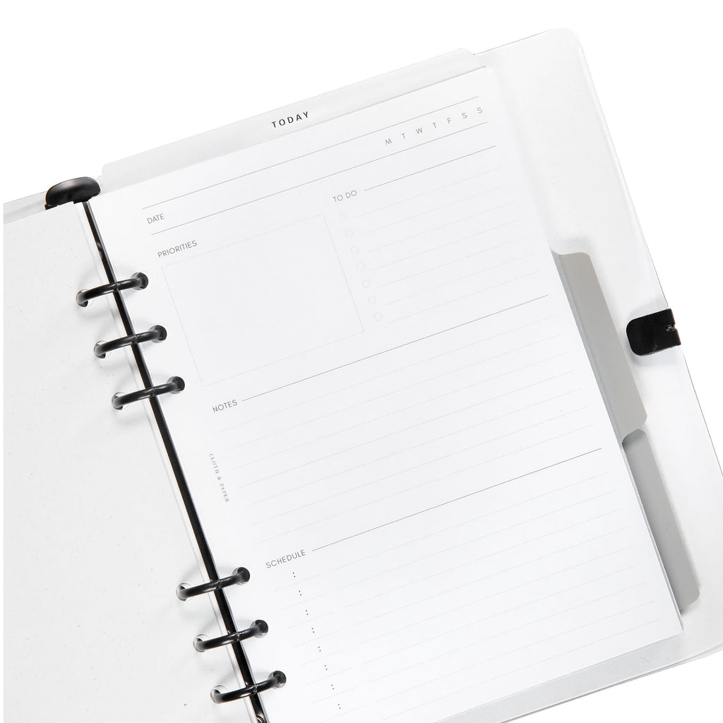 CP Petite Forma Modular Planner with six discs, clear cover with printed text, neutral dashboard labeled ‘Forma,’ top tab Today divider, and three side tab dividers, shown against a neutral grey background with a contents tag attached to the front. Close-up of a planner’s front tag label showing printed text describing an undated, customizable, refillable planner set with ready-to-use accessories and varied layouts.
