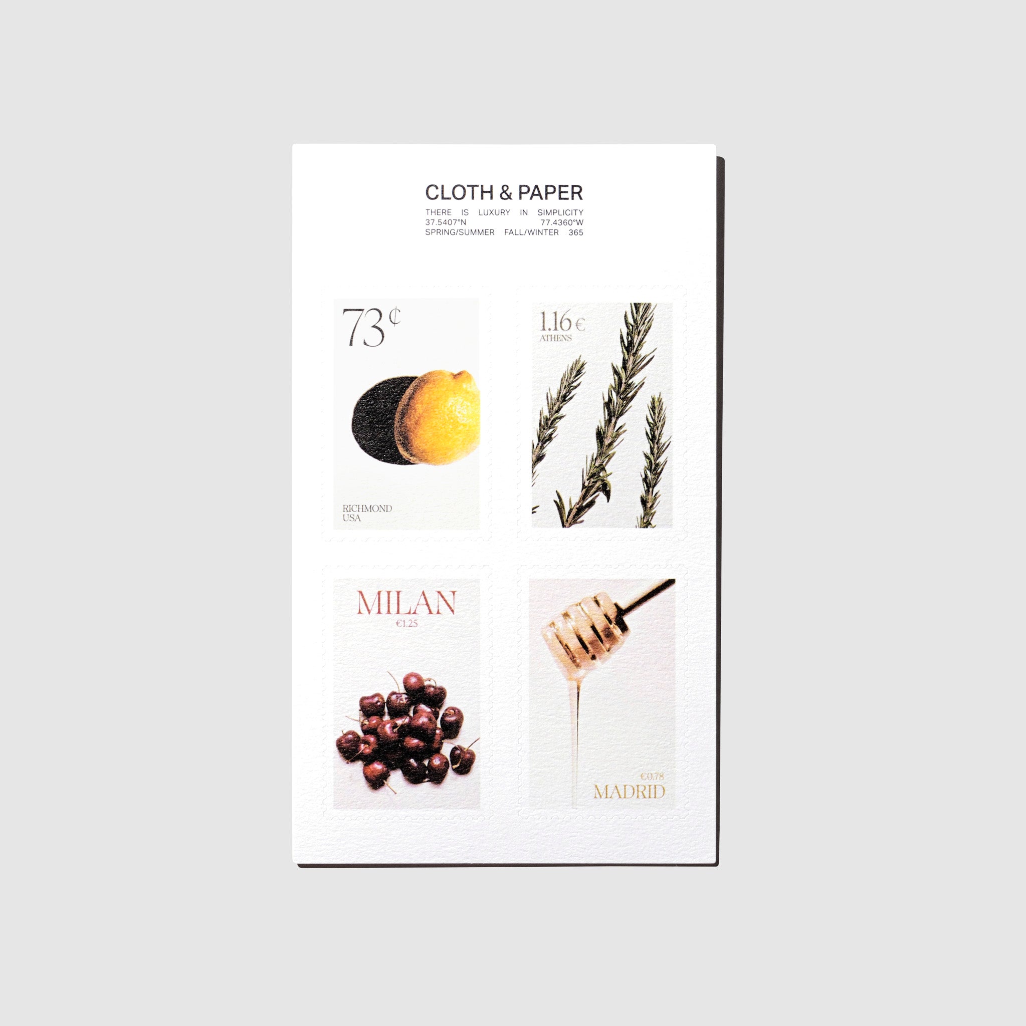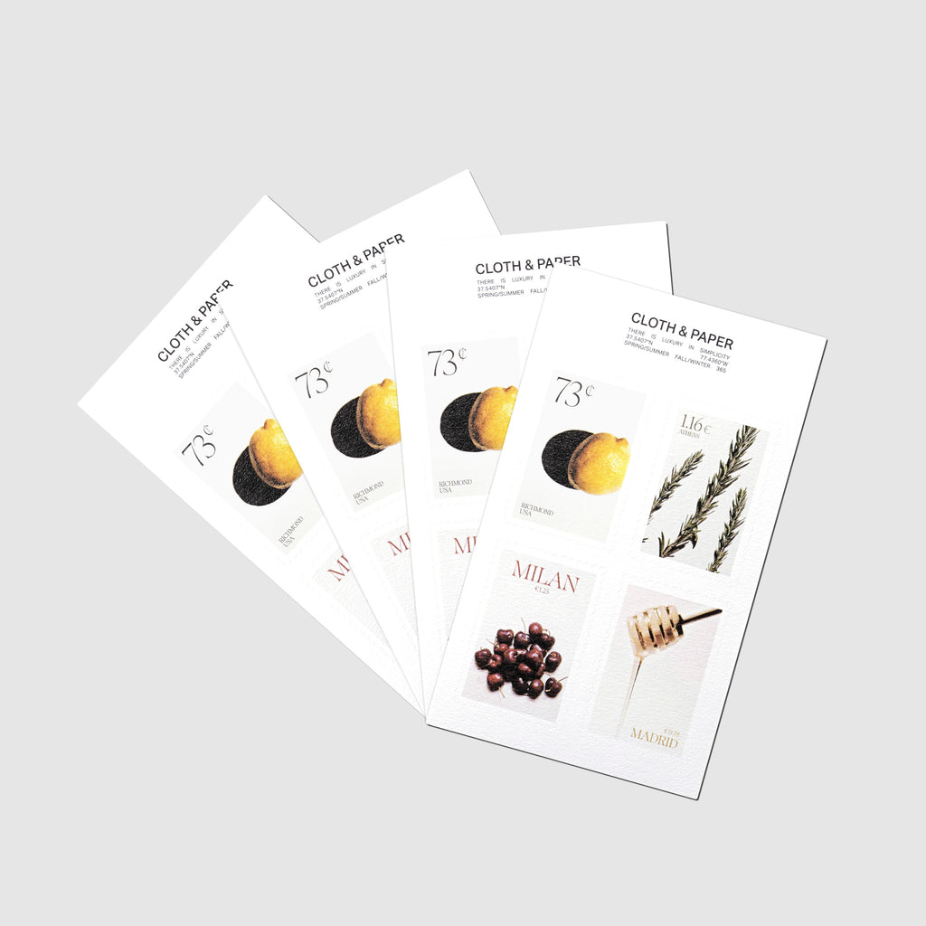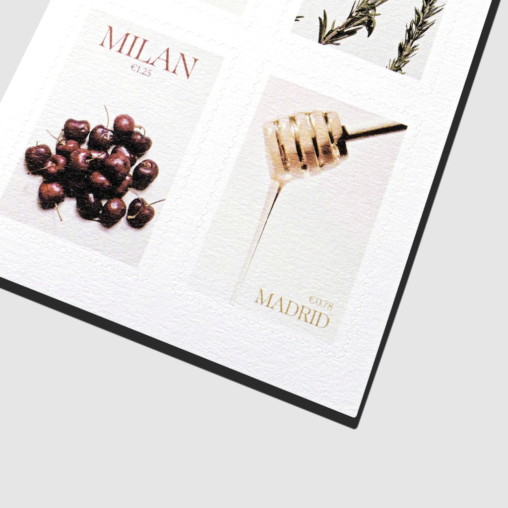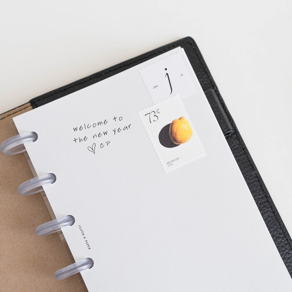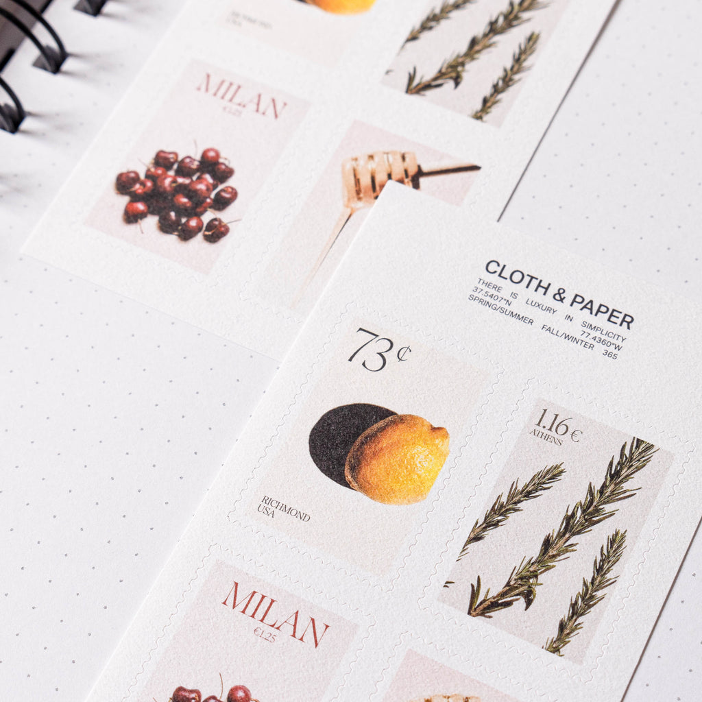 Stamp planner stickers on matte textured paper with decorative postage-inspired designs, blending functionality with artistic flair.