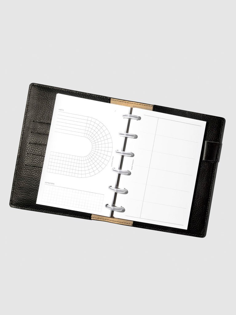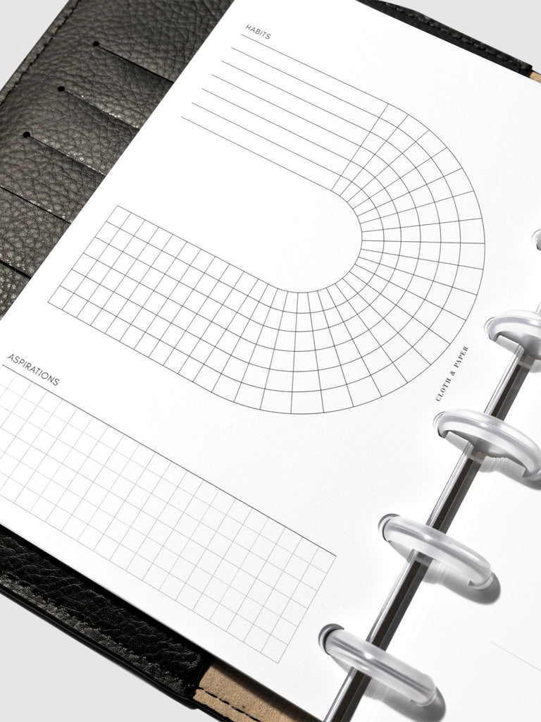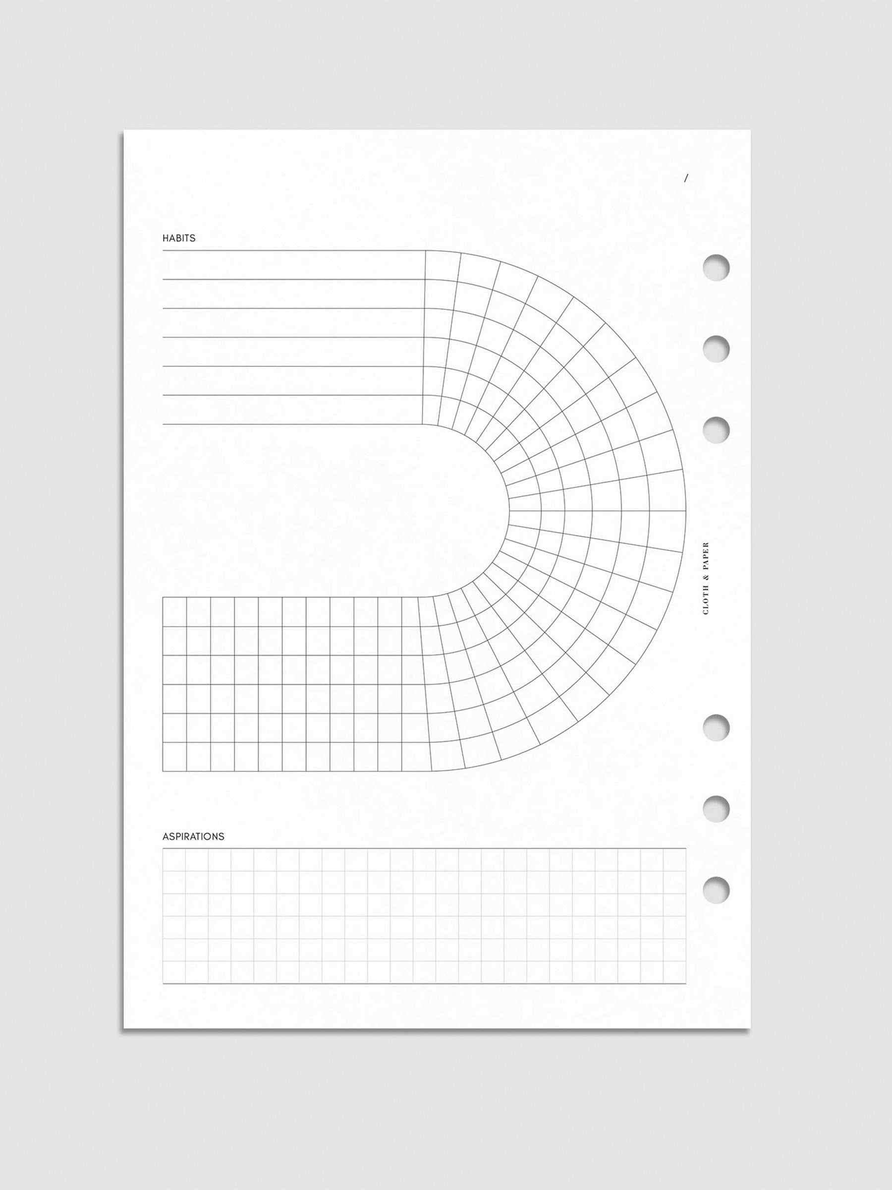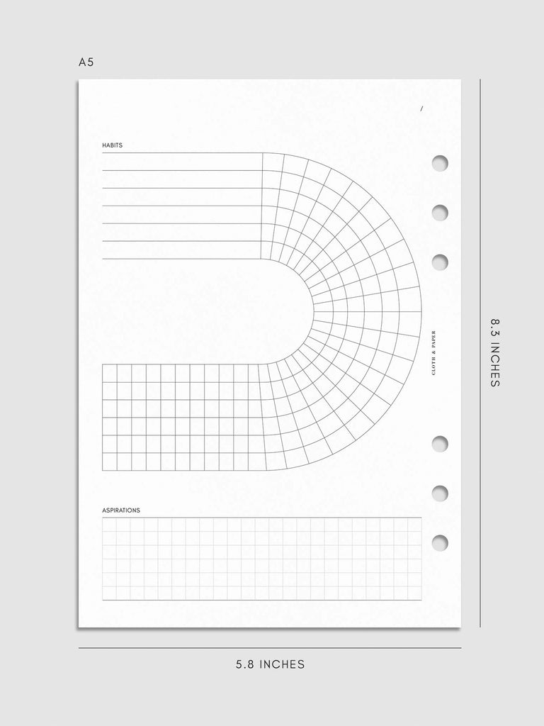 A planner insert with arched monthly trackers for up to six habits, paired with reflection and notes pages.