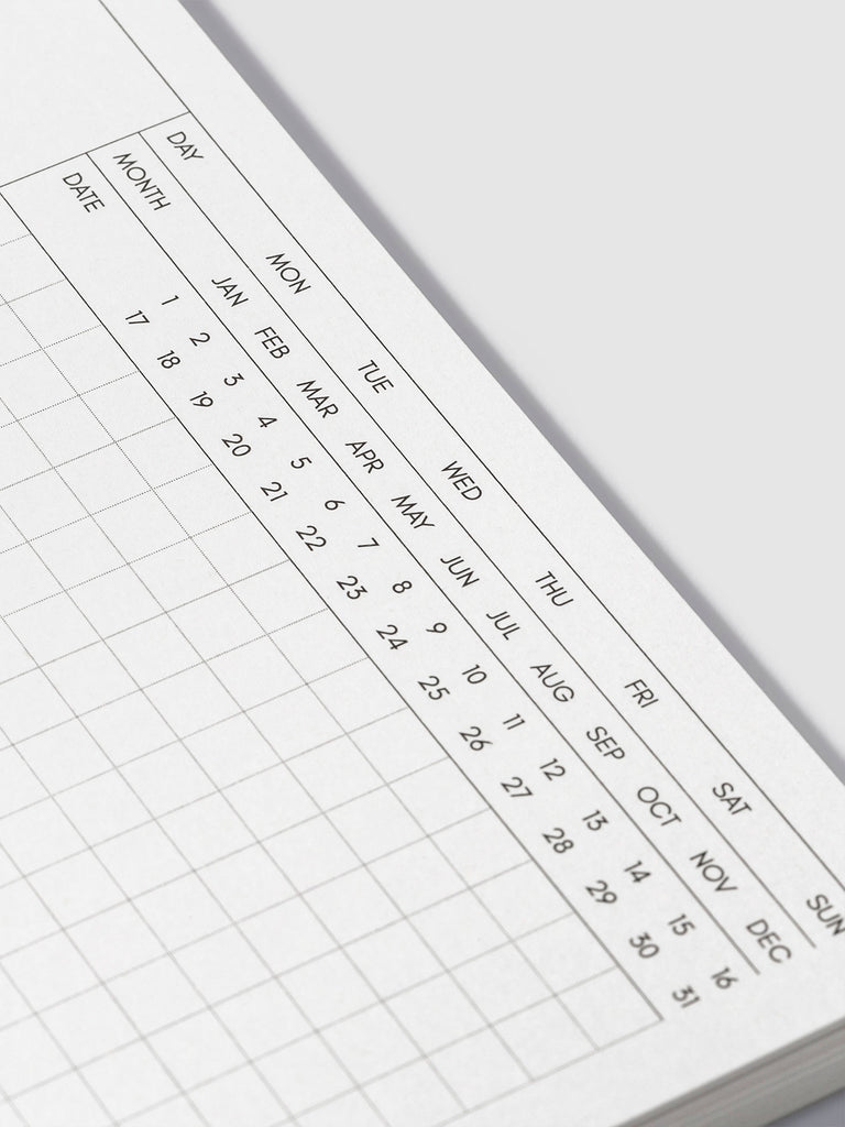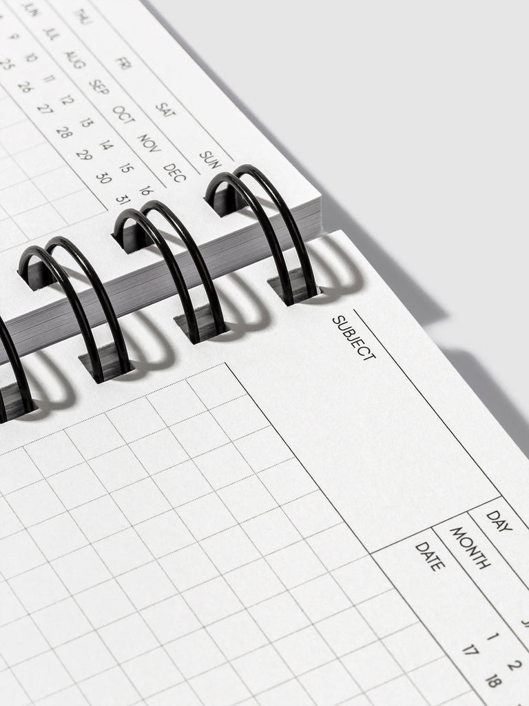 Notebook with packaging displayed on a neutral background. Color pictured is Ash.