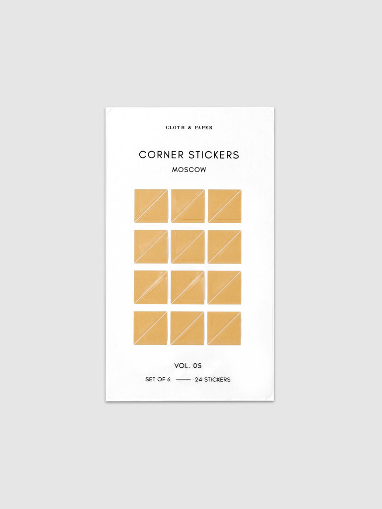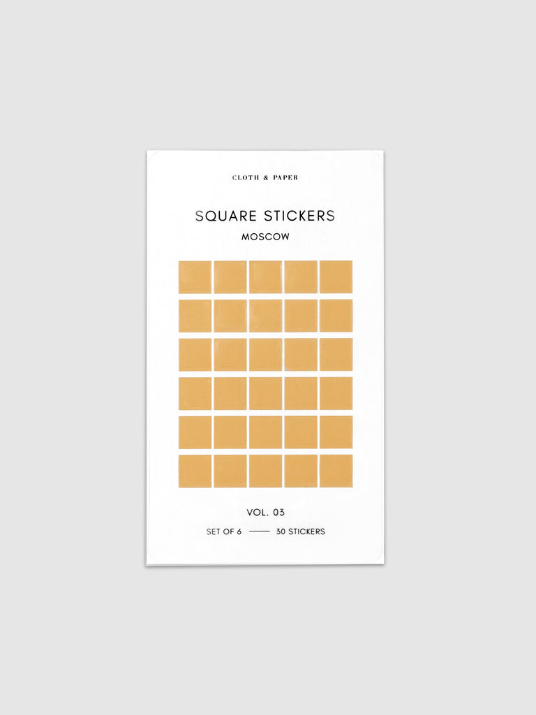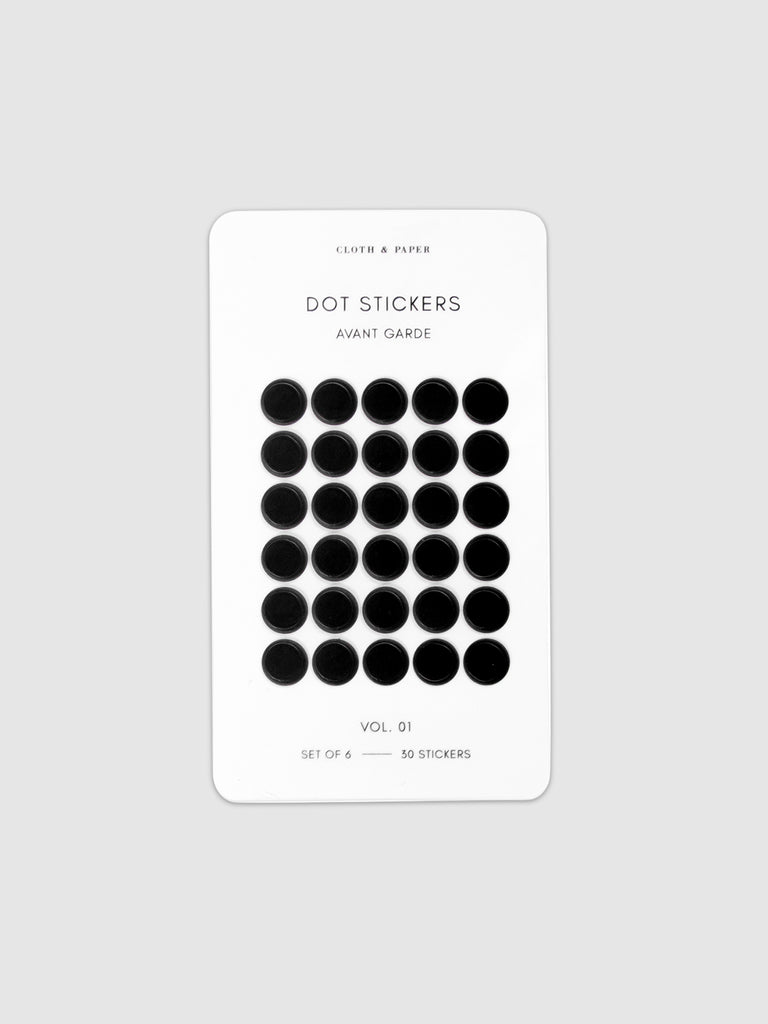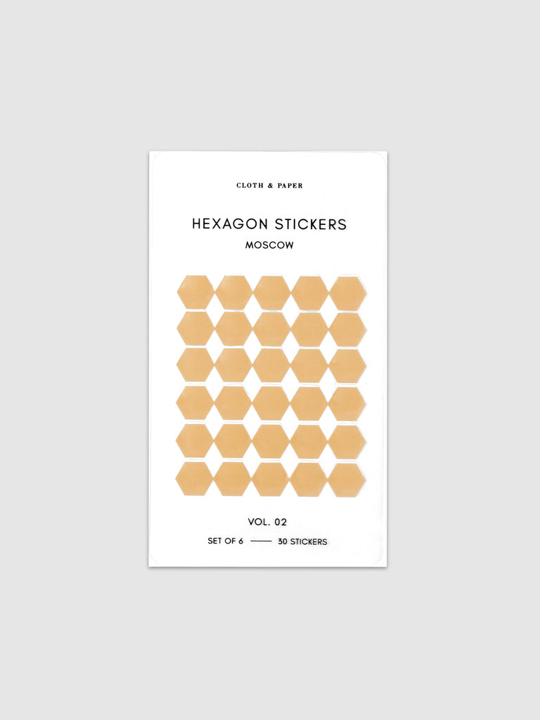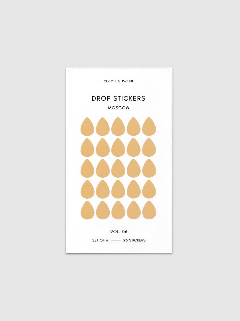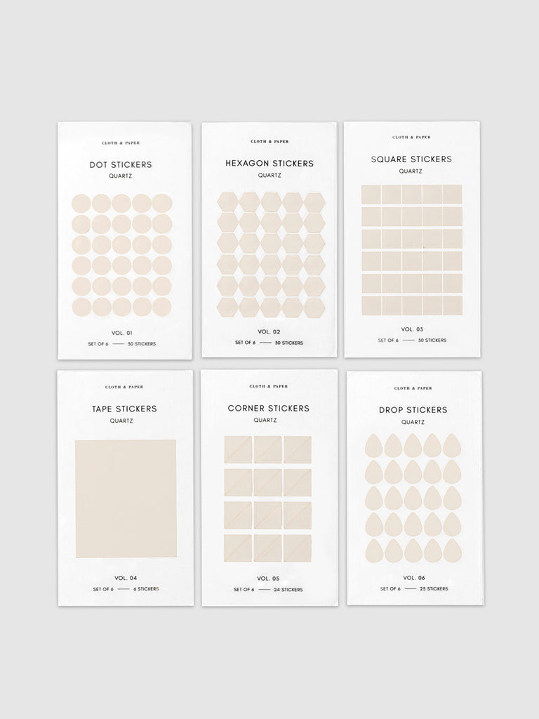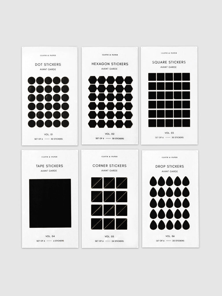Mini Shape Sticker Set, Transparent, Avant Garde, Cloth and Paper. One of each sticker sheet laid out next to each other, 3 on top and 3 below. Stickers sheets are all perpendicular to each other, turned slightly to the right against a neutral background.