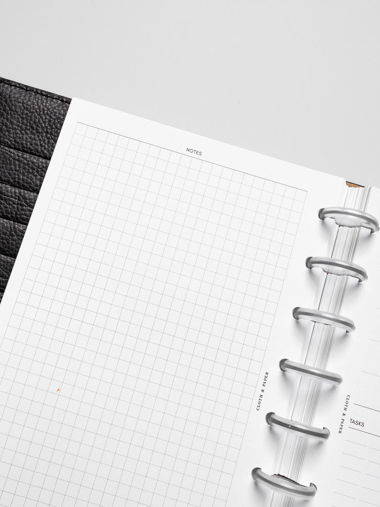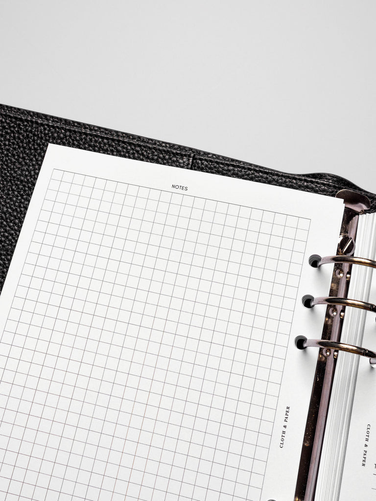 A planner insert with undated monthly calendars on the front and grid notes pages on the back.