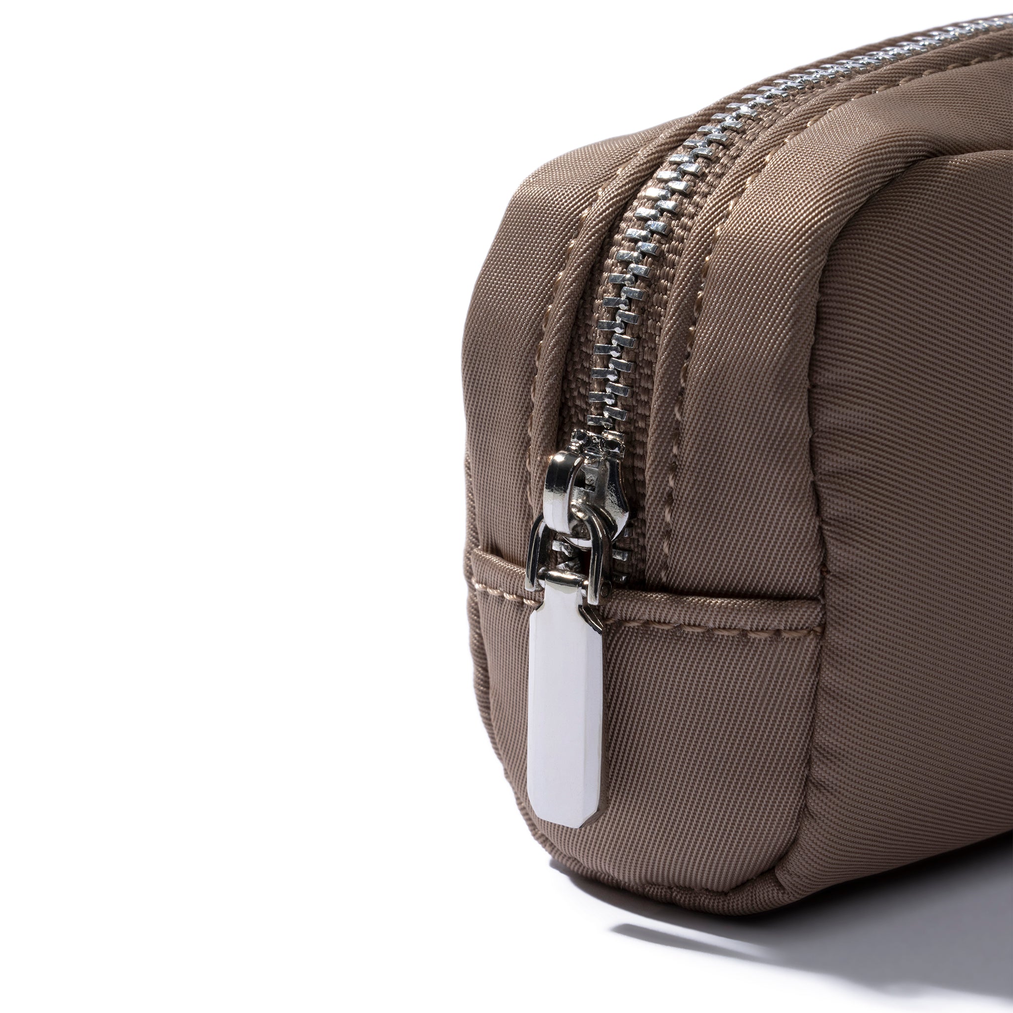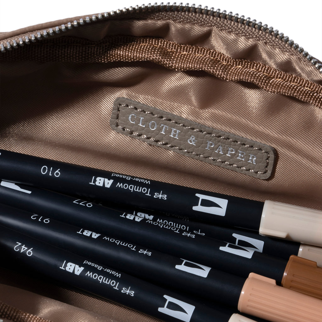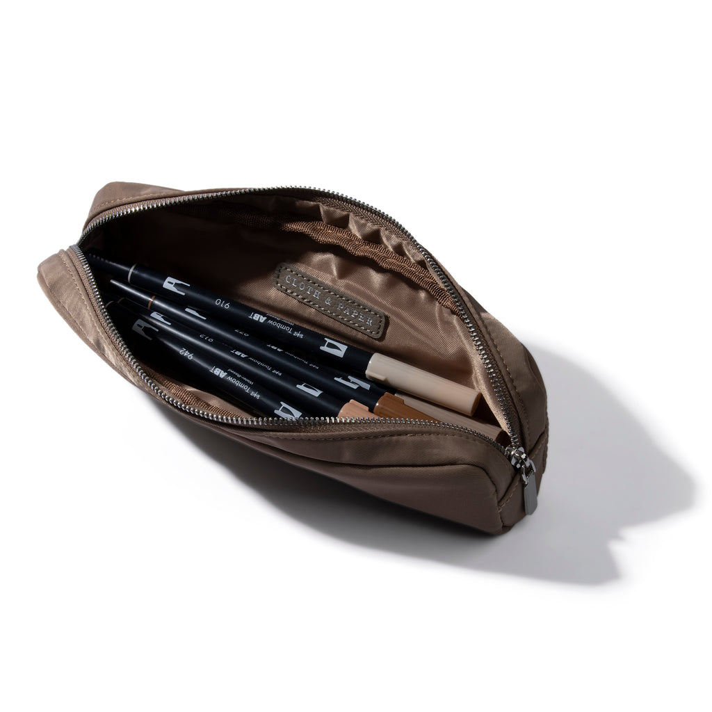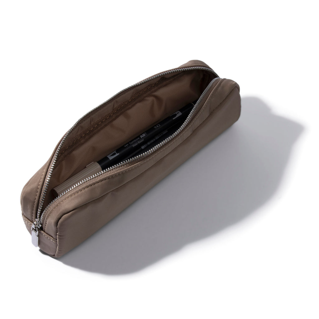 Nylon pencil pouch with a lined interior and silver zipper, offering ample space for pens, brushes, or travel essentials.