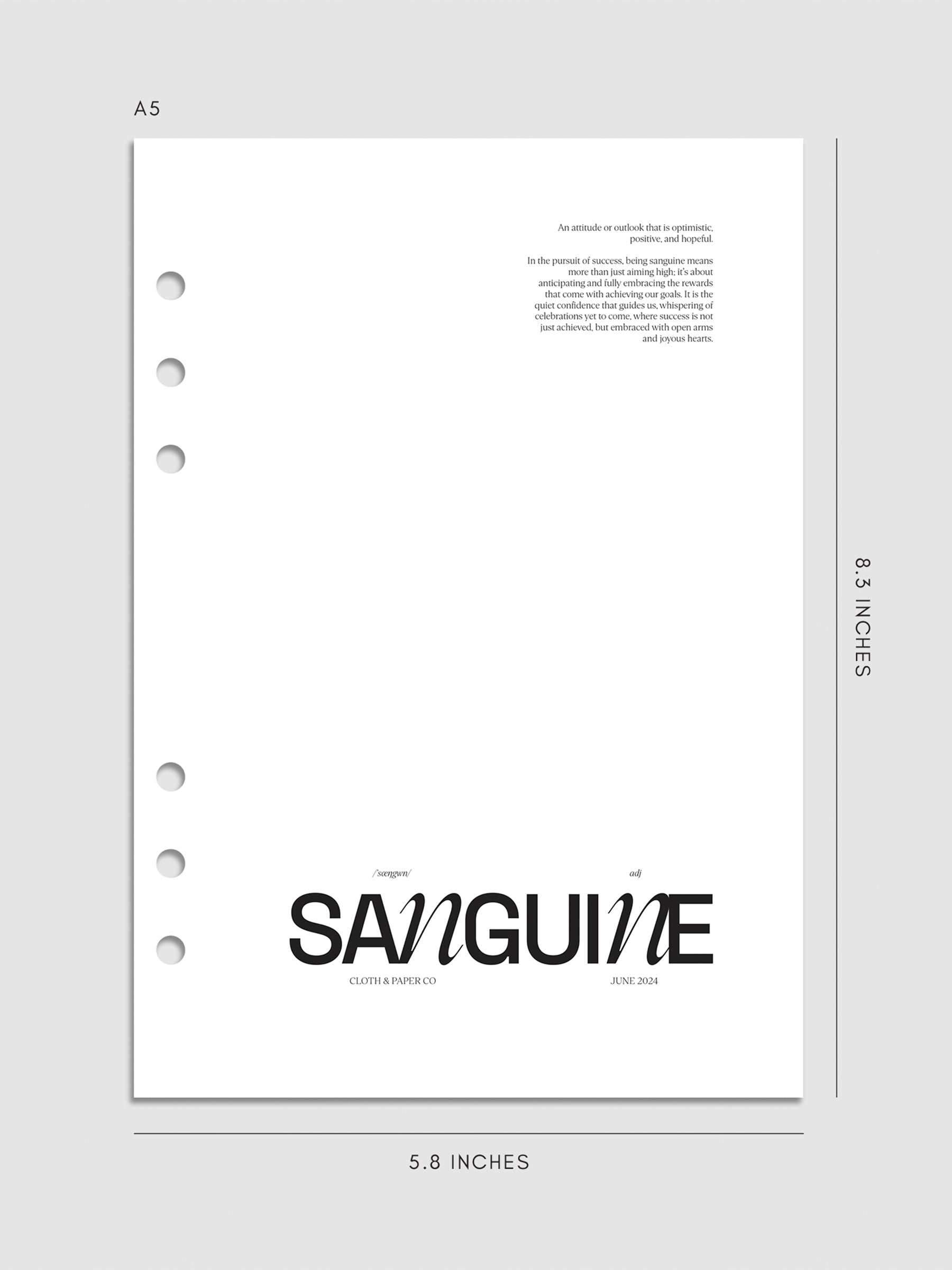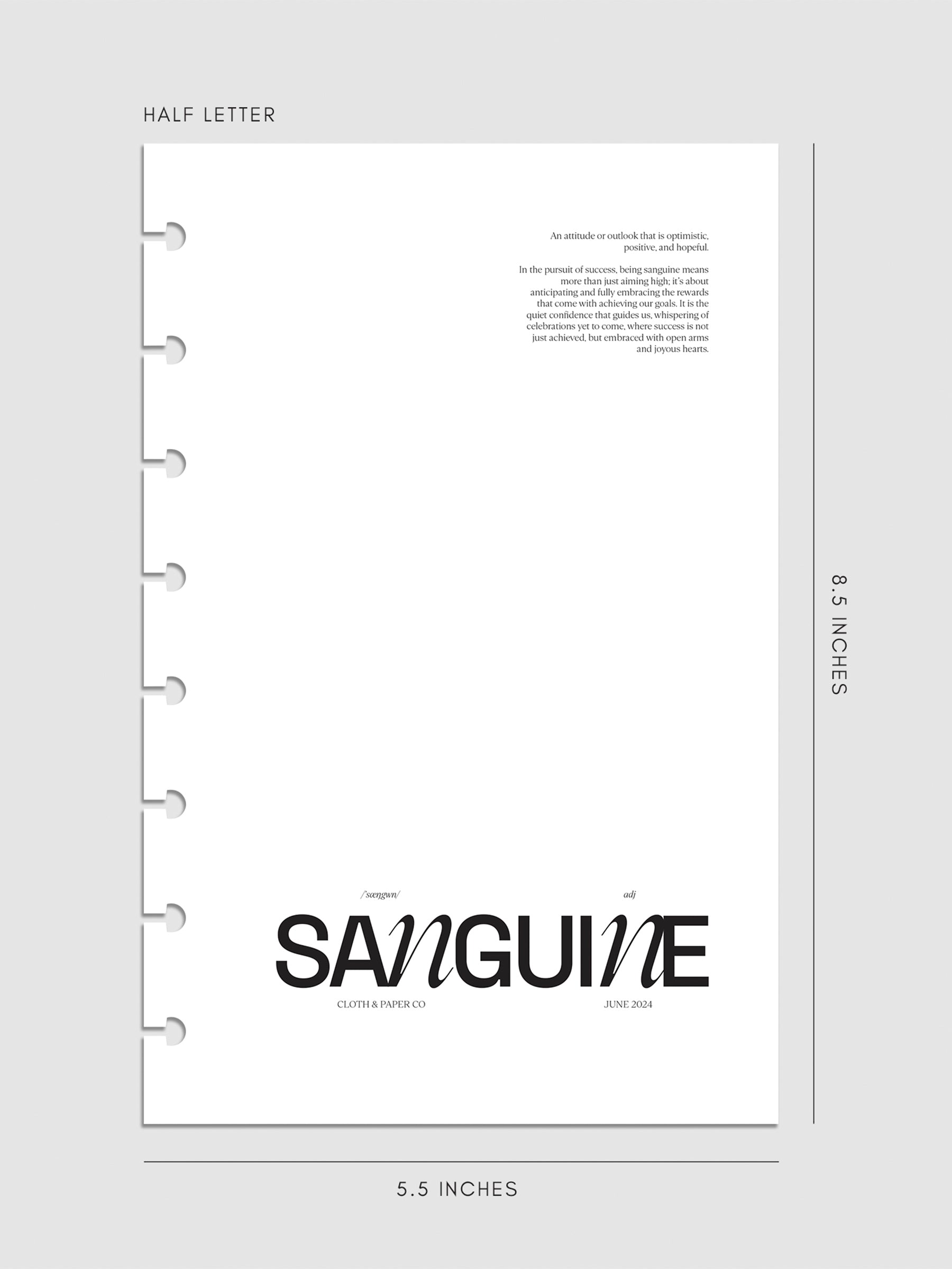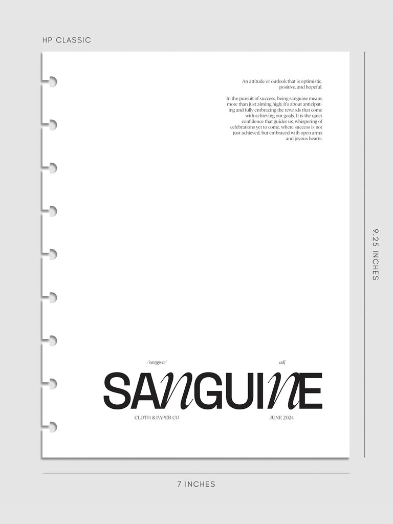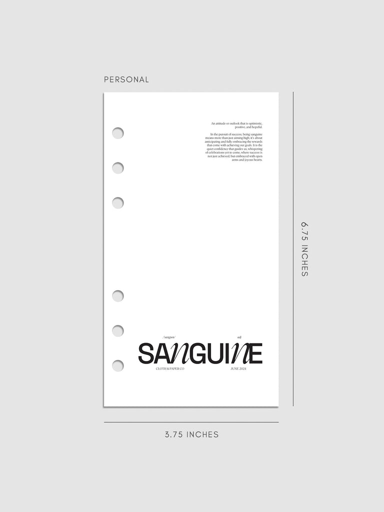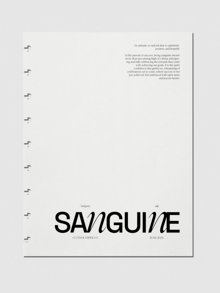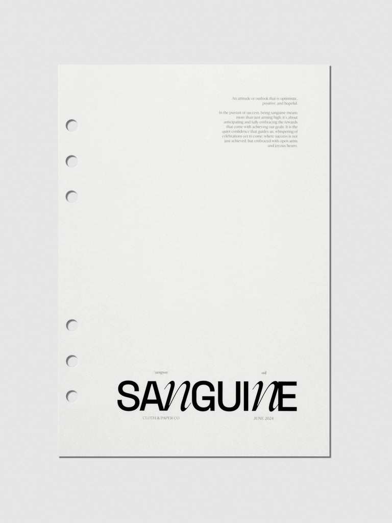 A heavyweight vellum planner dashboard printed in black ink with the word Sanguine and its definition.