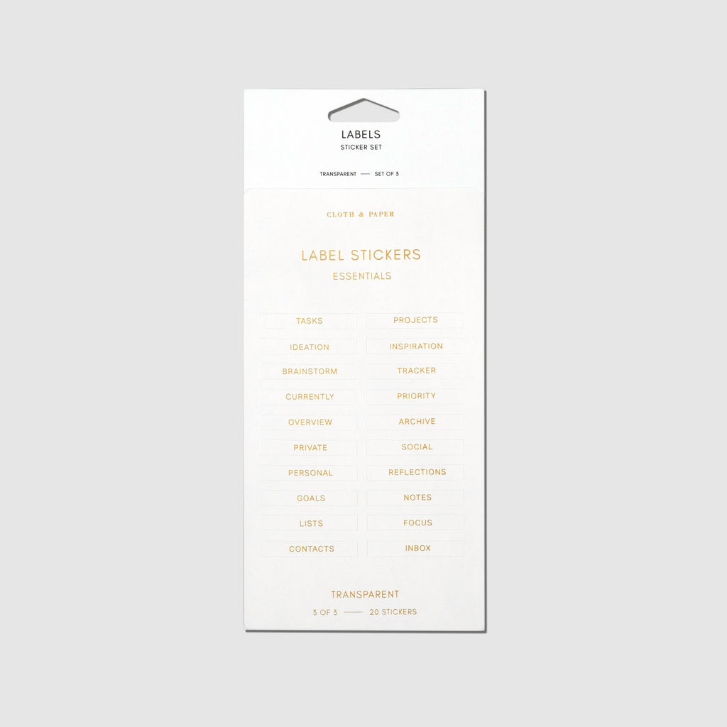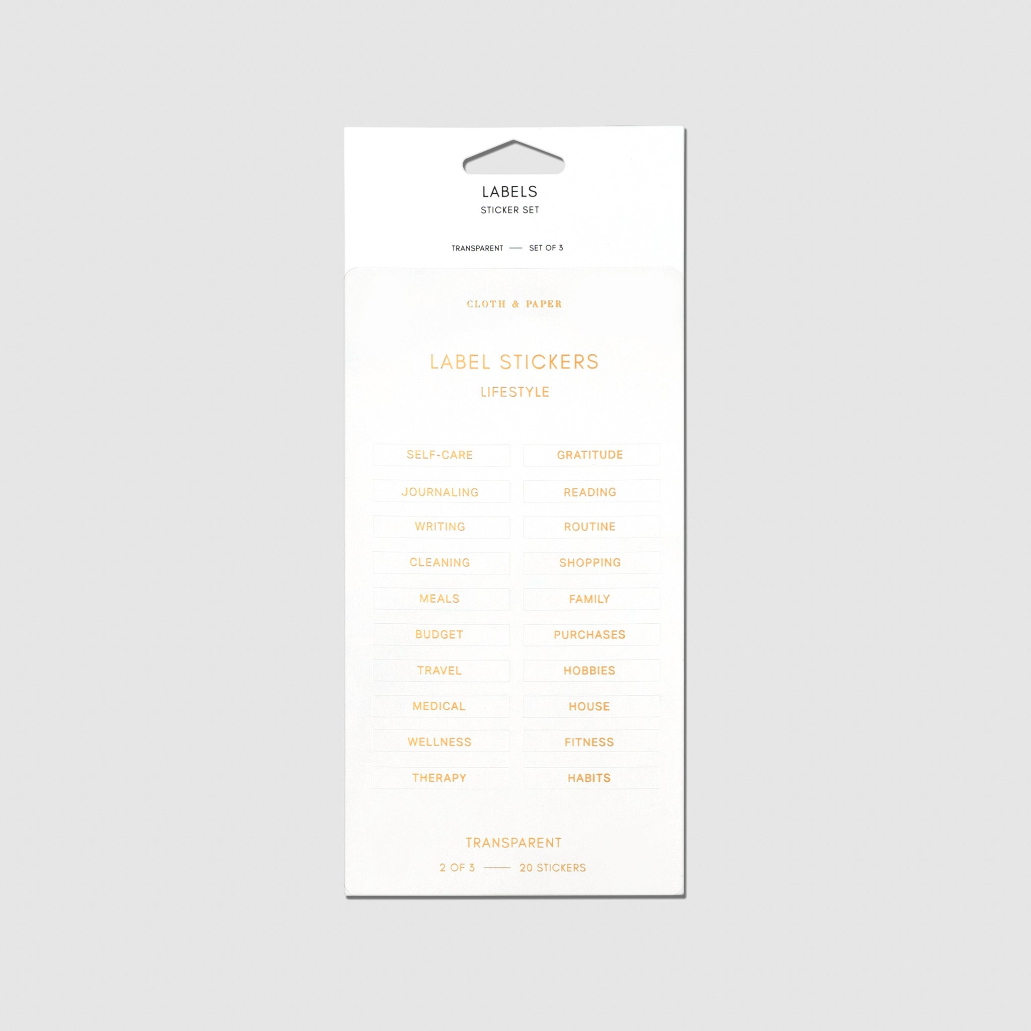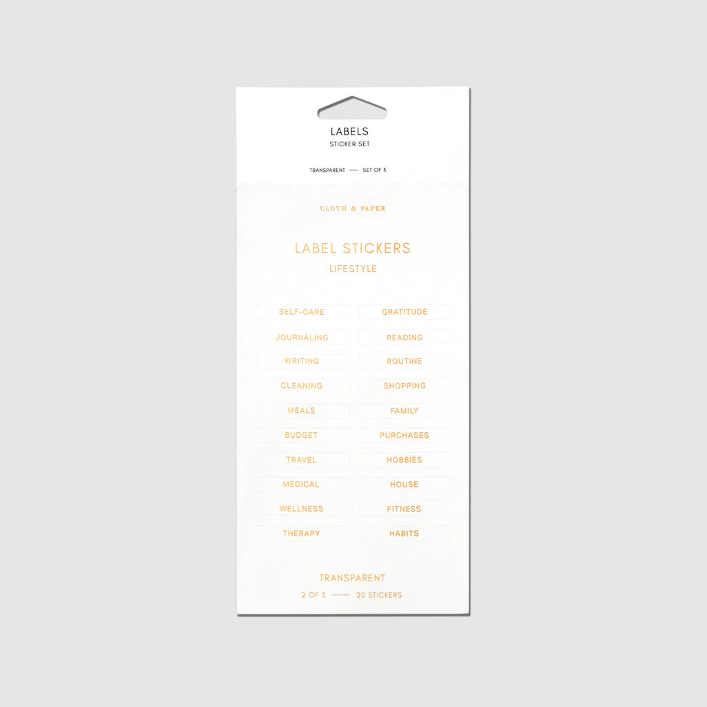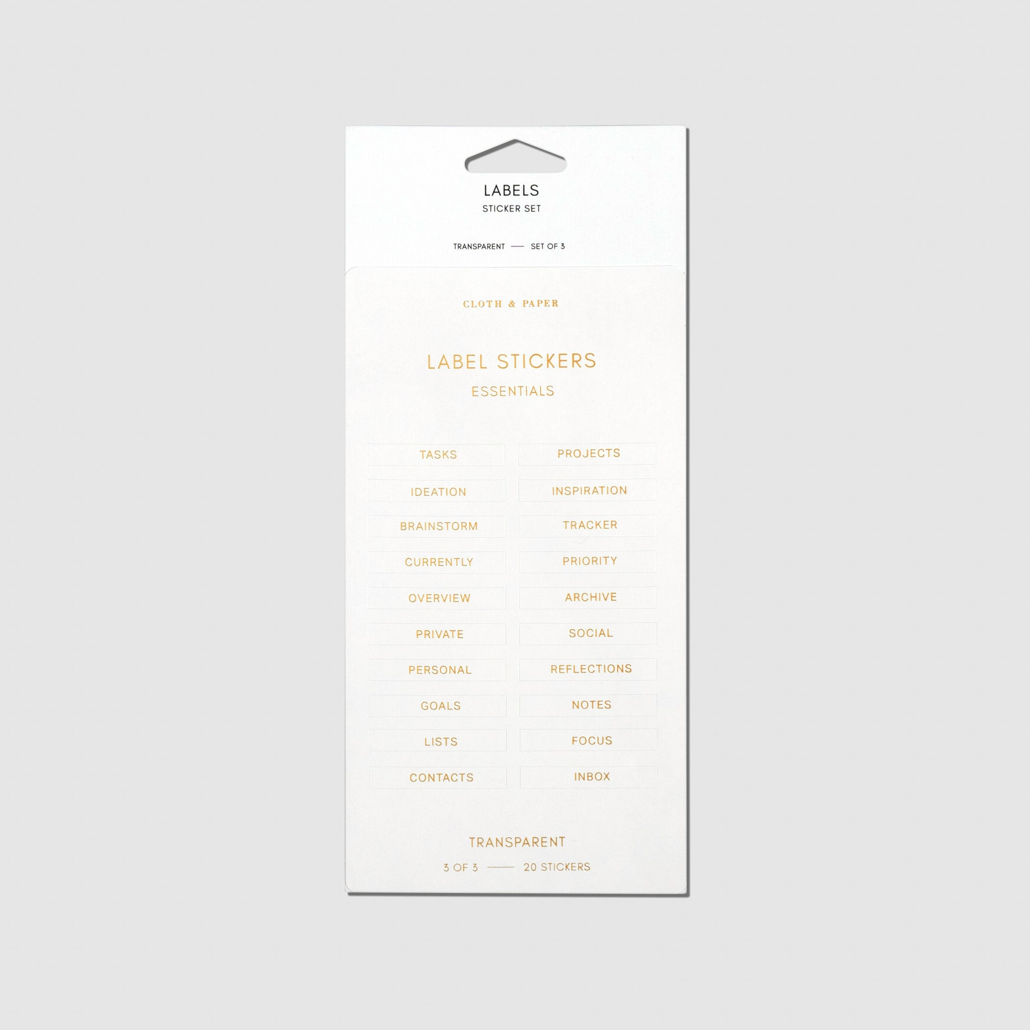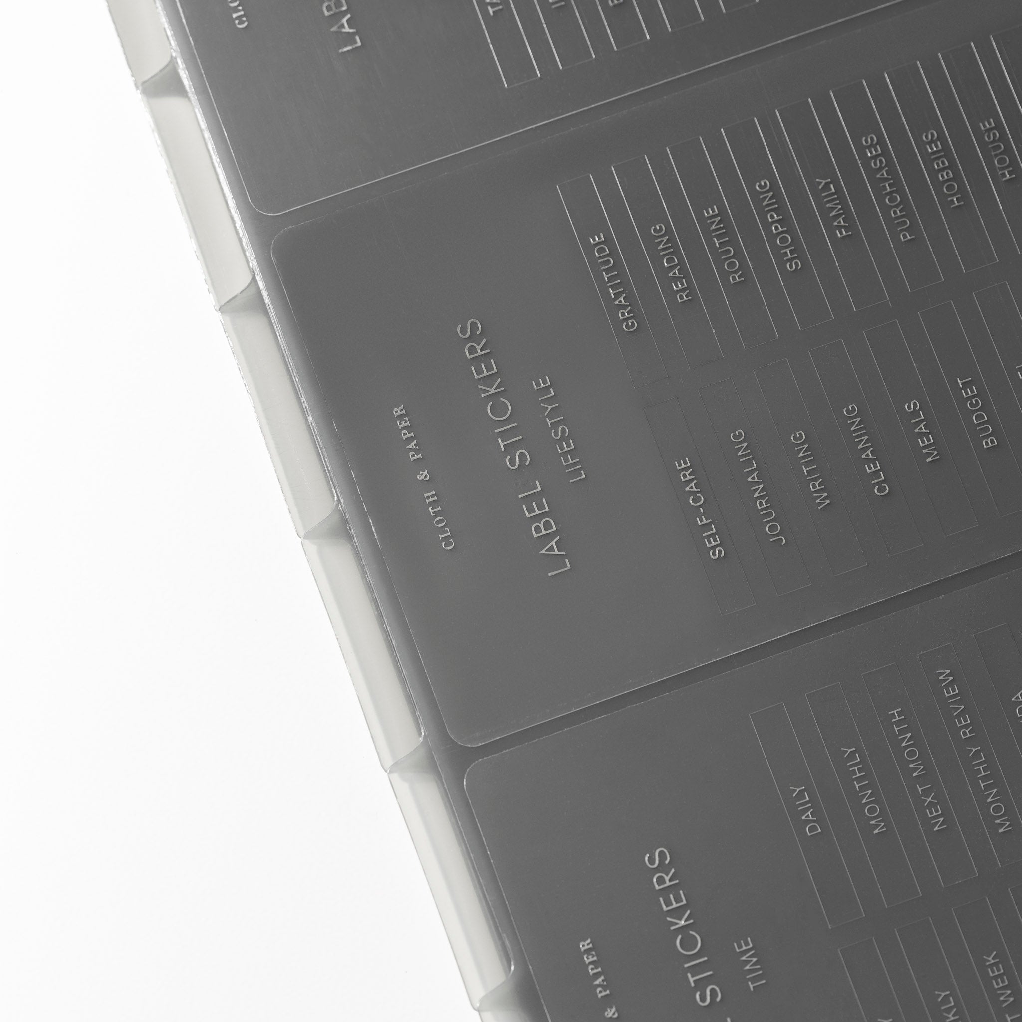 Clear label stickers on transparent material with silver, gold, or black foil text, offering 60 categorized labels for elegant organization.