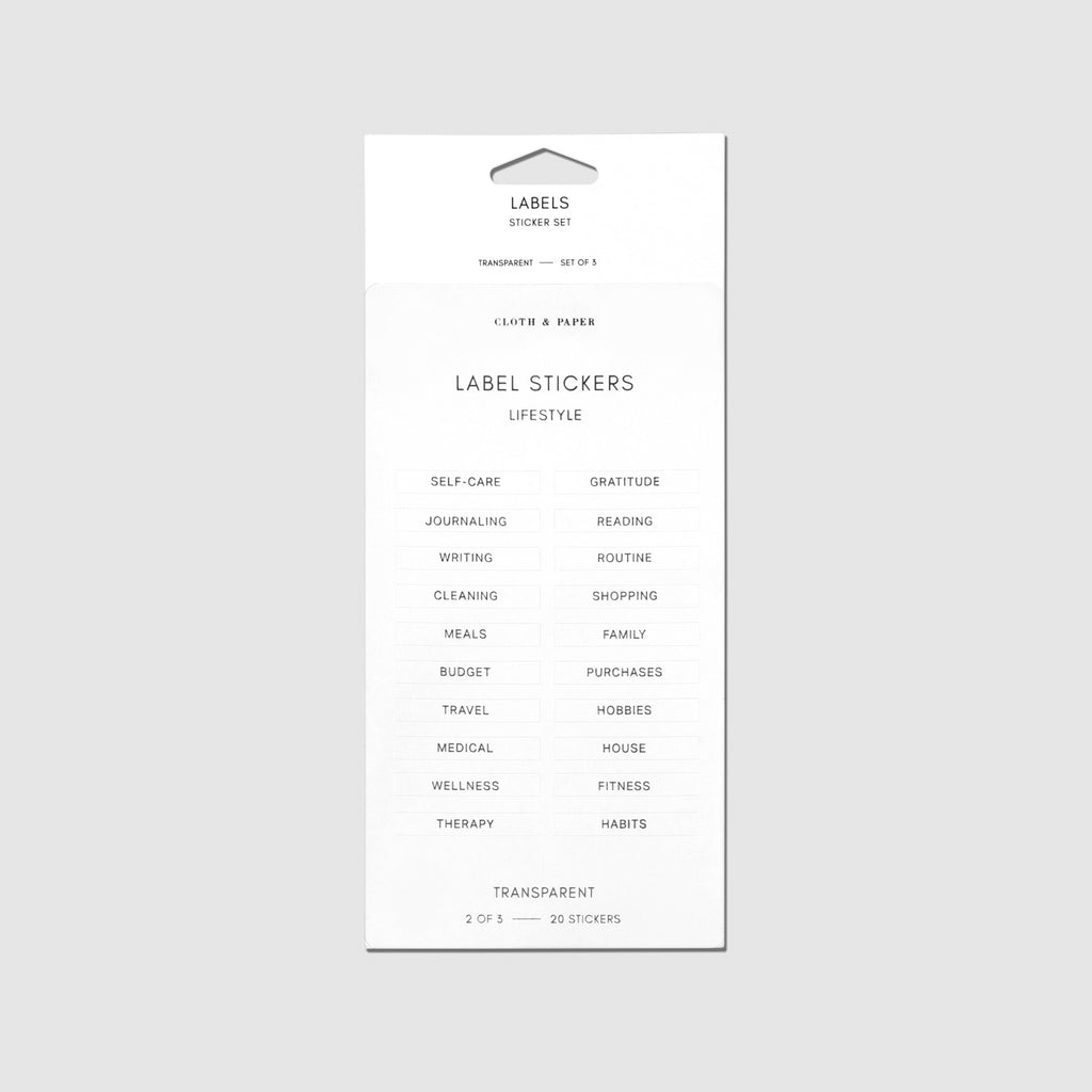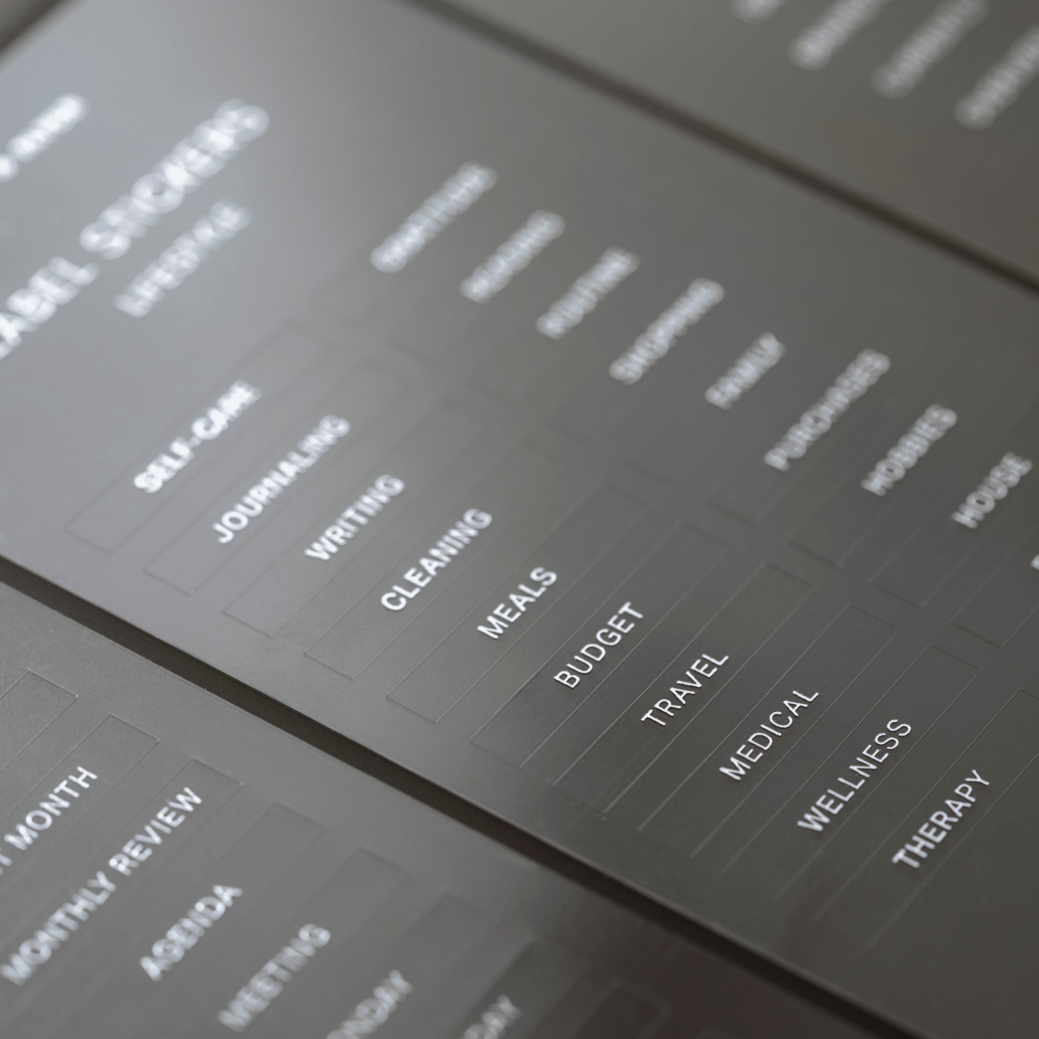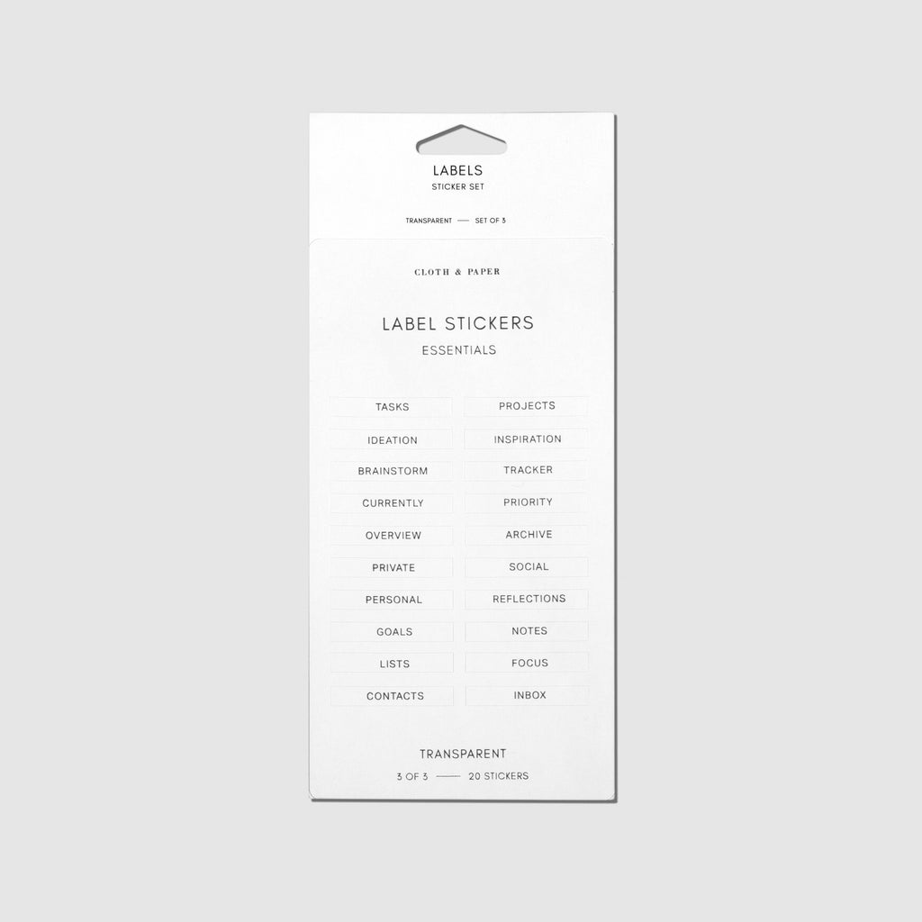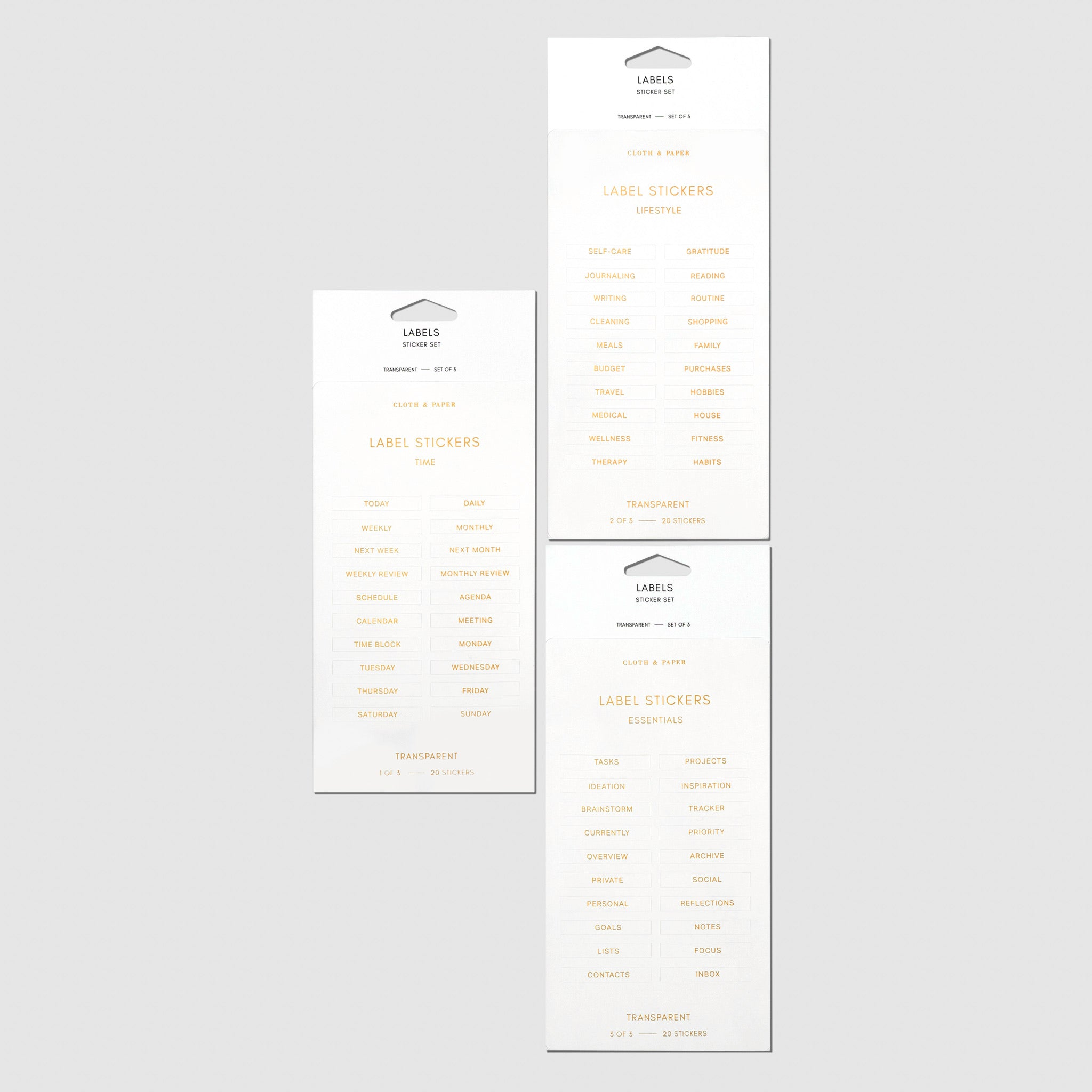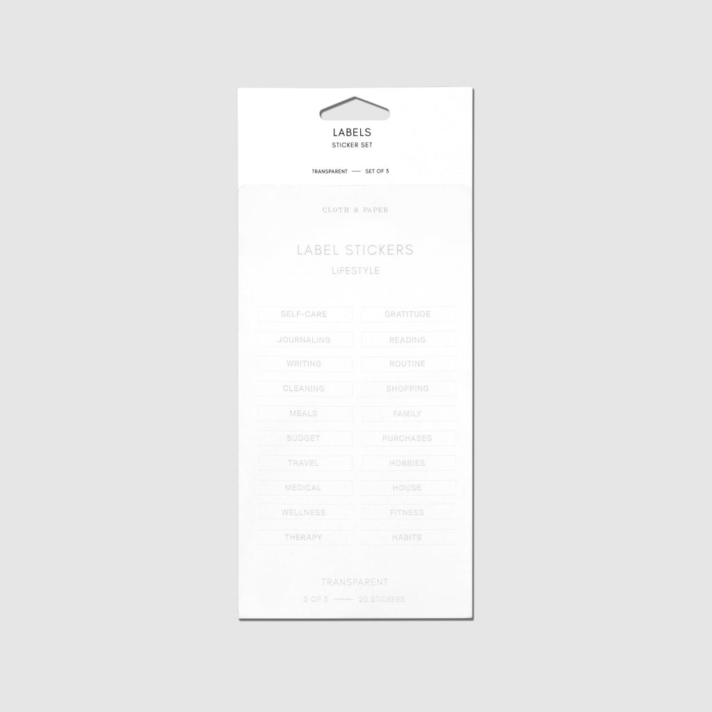 Clear label stickers on transparent material with silver, gold, or black foil text, offering 60 categorized labels for elegant organization.