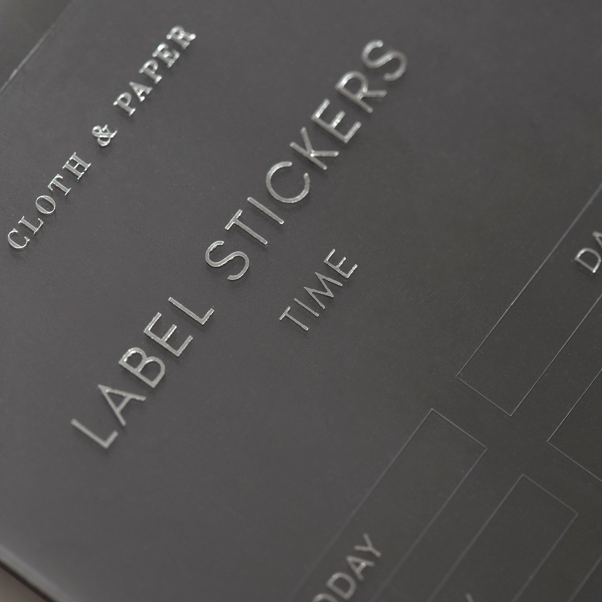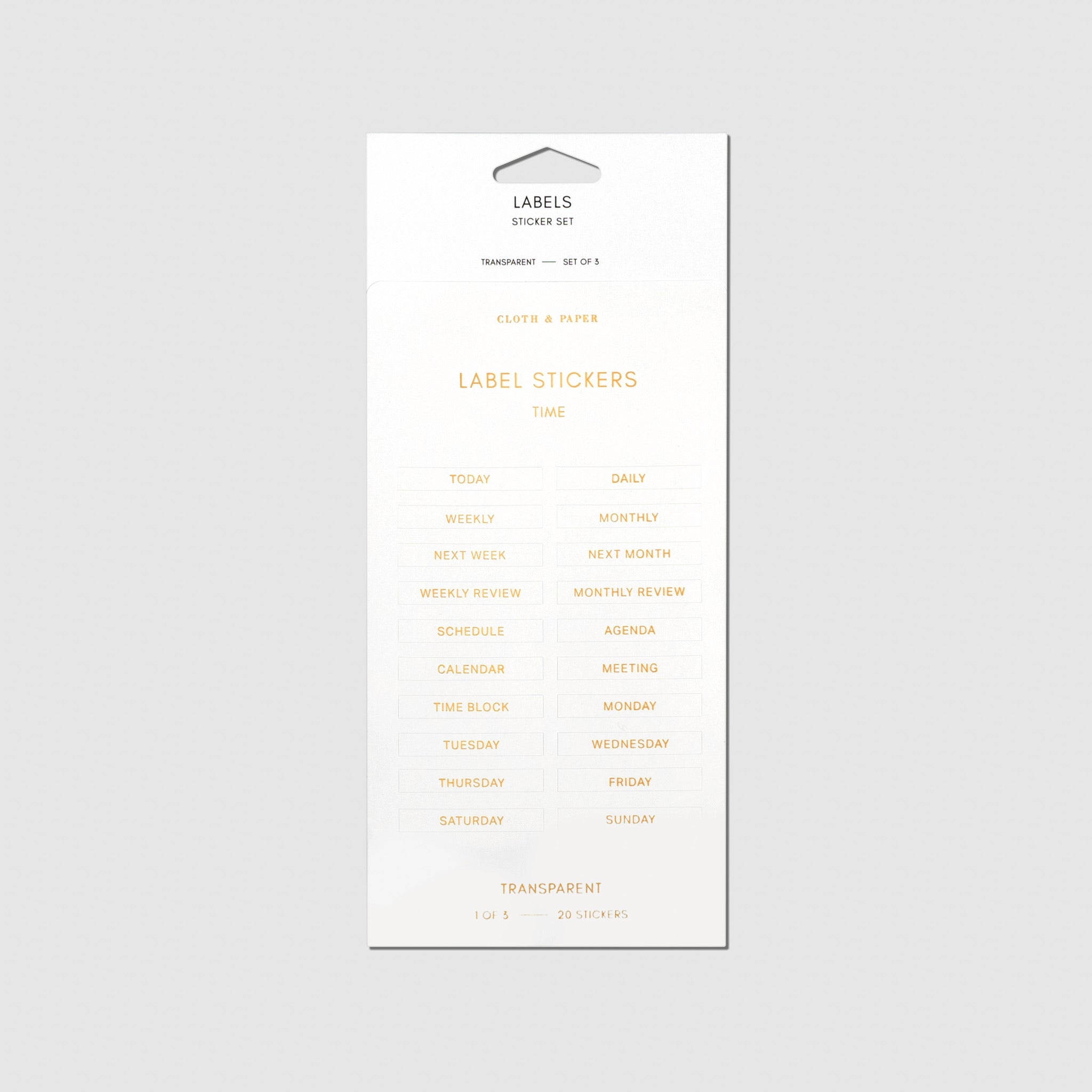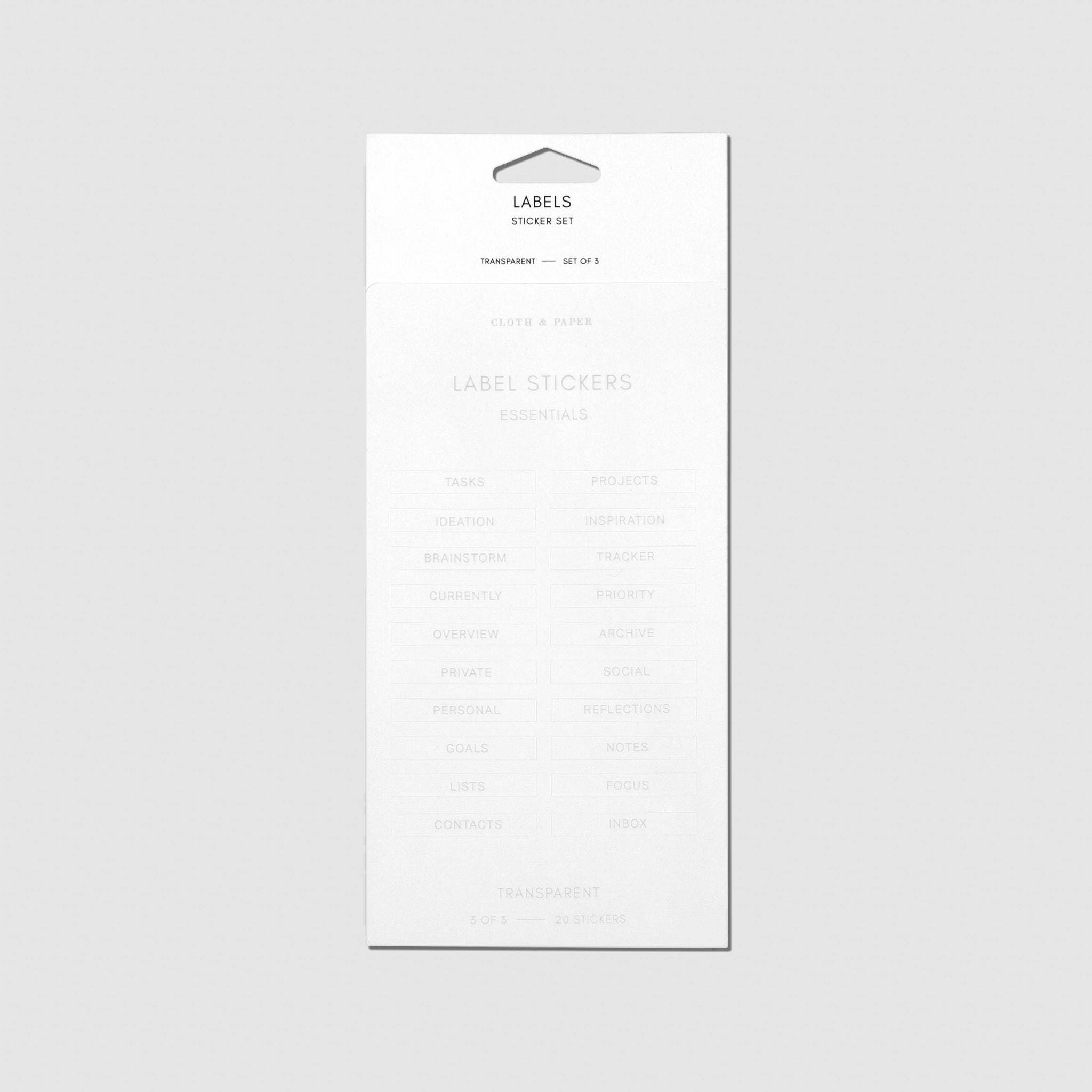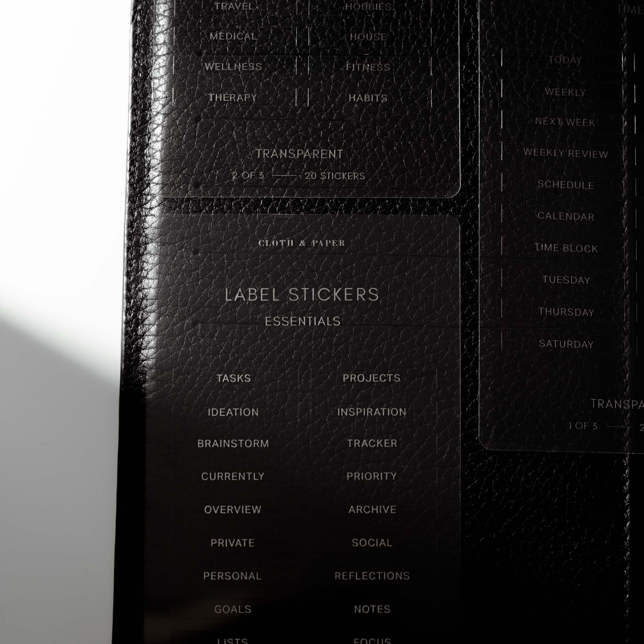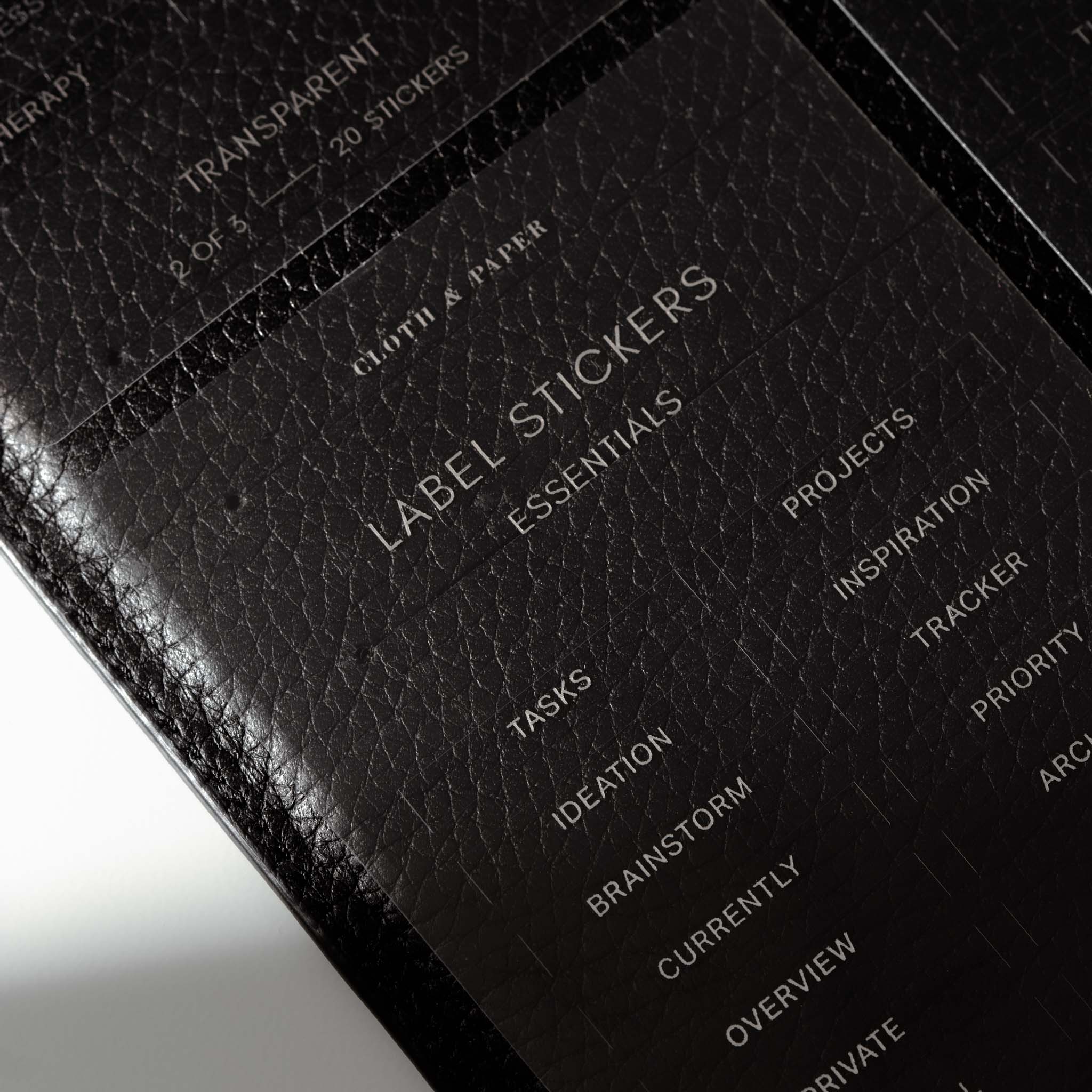 Clear label stickers on transparent material with silver, gold, or black foil text, offering 60 categorized labels for elegant organization.