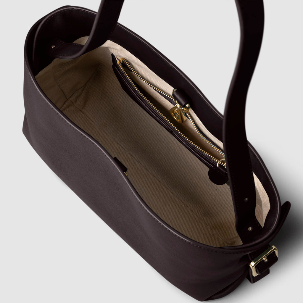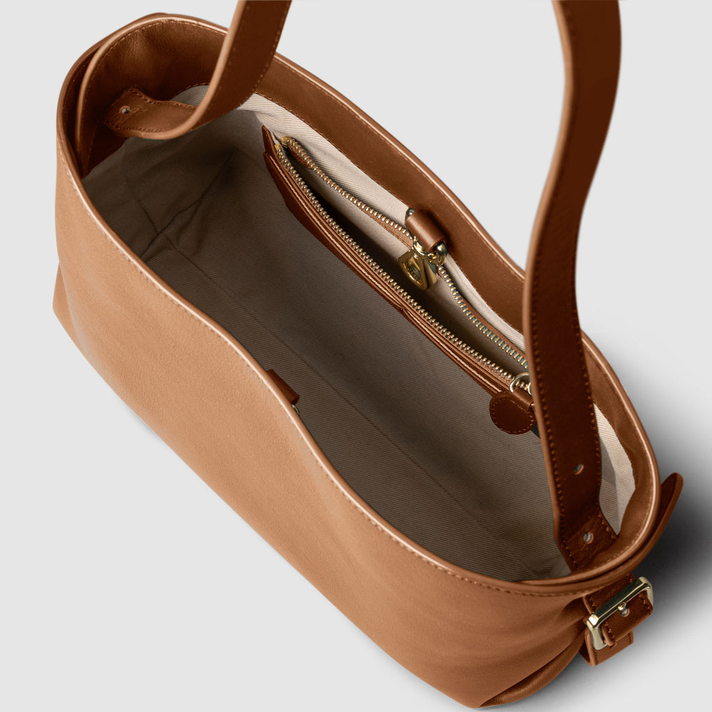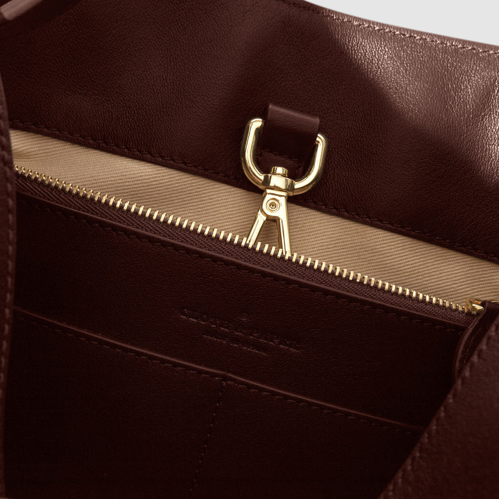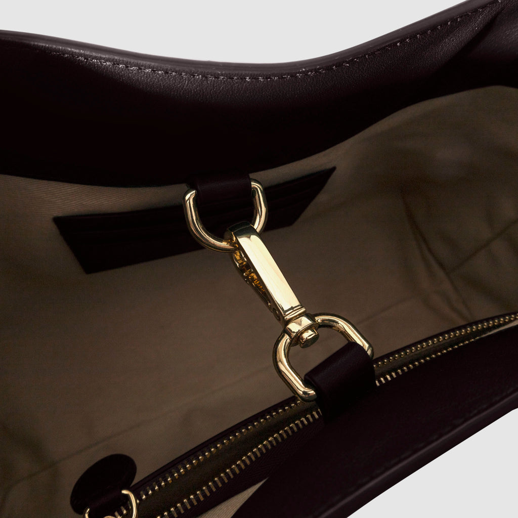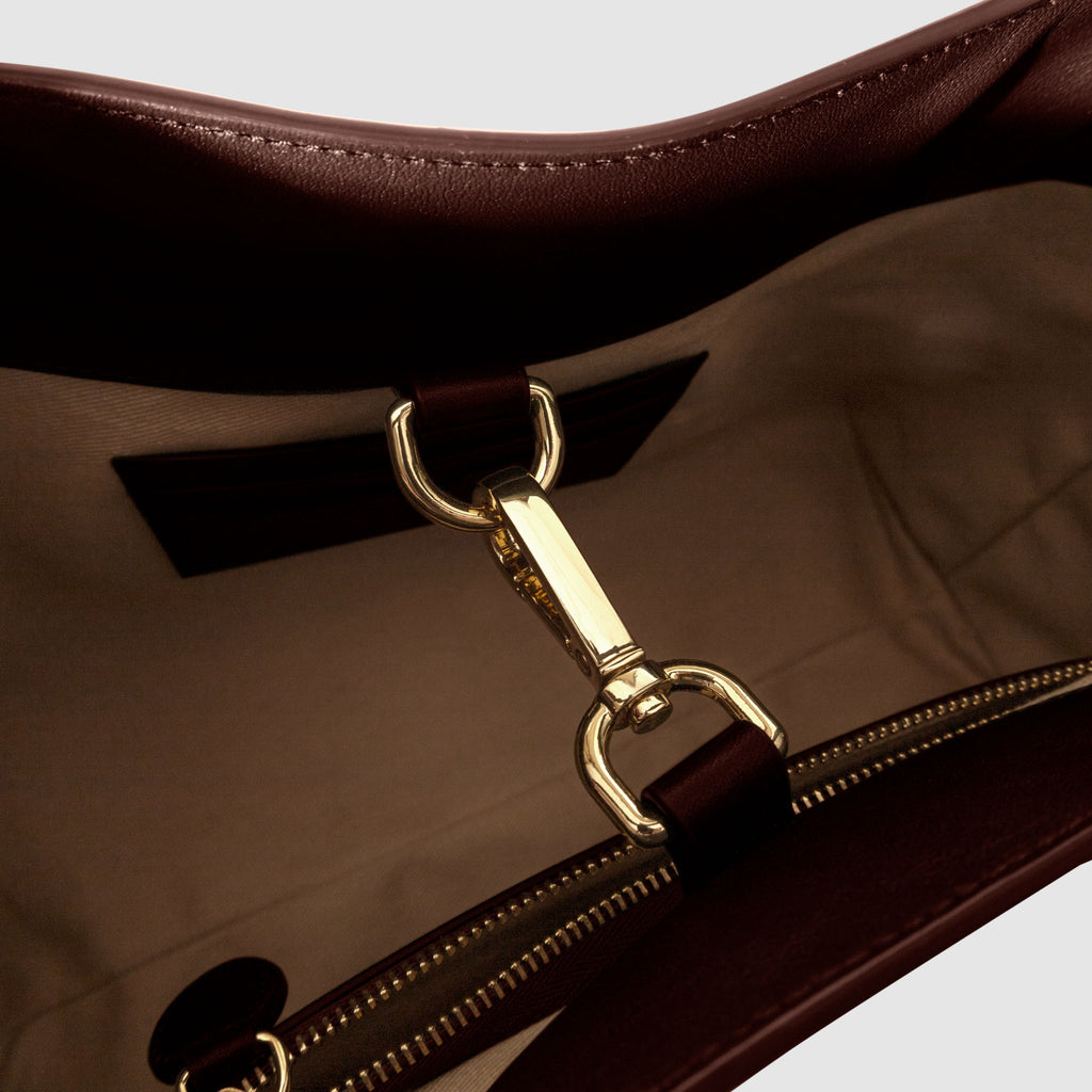 Valencia Bag in genuine Spanish cowhide leather with gold hardware, featuring a spacious compartment, internal zipper pocket, and credit card slots for elegant, versatile carrying.