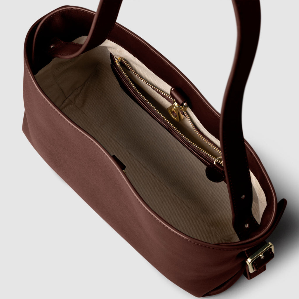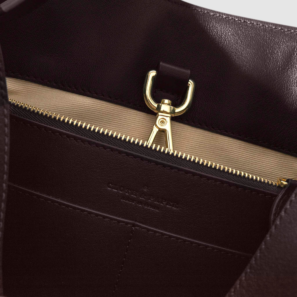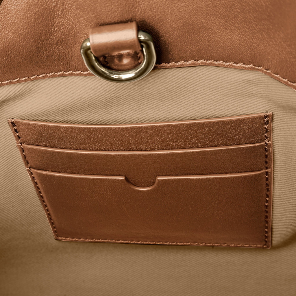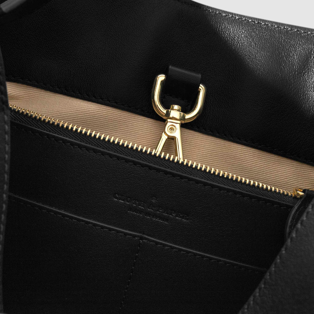 Valencia Bag in genuine Spanish cowhide leather with gold hardware, featuring a spacious compartment, internal zipper pocket, and credit card slots for elegant, versatile carrying.